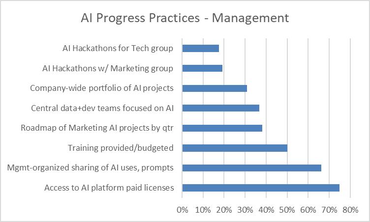 Only 30% of marketers are even aware of a company-wide AI project portfolio, and just 38% say their marketing team has an AI roadmap. That means most departments are still experimenting in silos—missing the compounding benefits of putting plans out for others to contribute, leaders to emerge and to get the benefit from coordinated investment.
