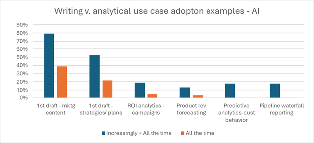 AI for every day marketing analytics is not yet a popular use cases for marketers. That may be the biggest AI adoption opportunity for leaders to drive actual RESULTS from their department (and in the career perception of individual marketers).