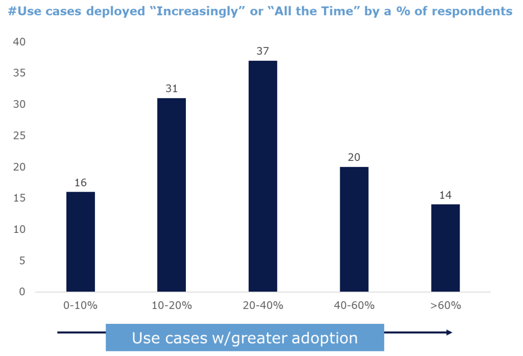 AAA data shows some extremes of AI adoption. Across 110 use cases, there were 14 use cases where >60% of respondents said they use AI “Increasingly” or “All the time.” In those areas AI has effectively become the way “everyone does things.” Meanwhile there were 16 use cases where <8% were adopting AI frequently. And despite the hype, 5,000 of 7,000+ individual responses were either “Not Yet” or “Planning To” regarding AI deployment for marketing use cases. It is still early.