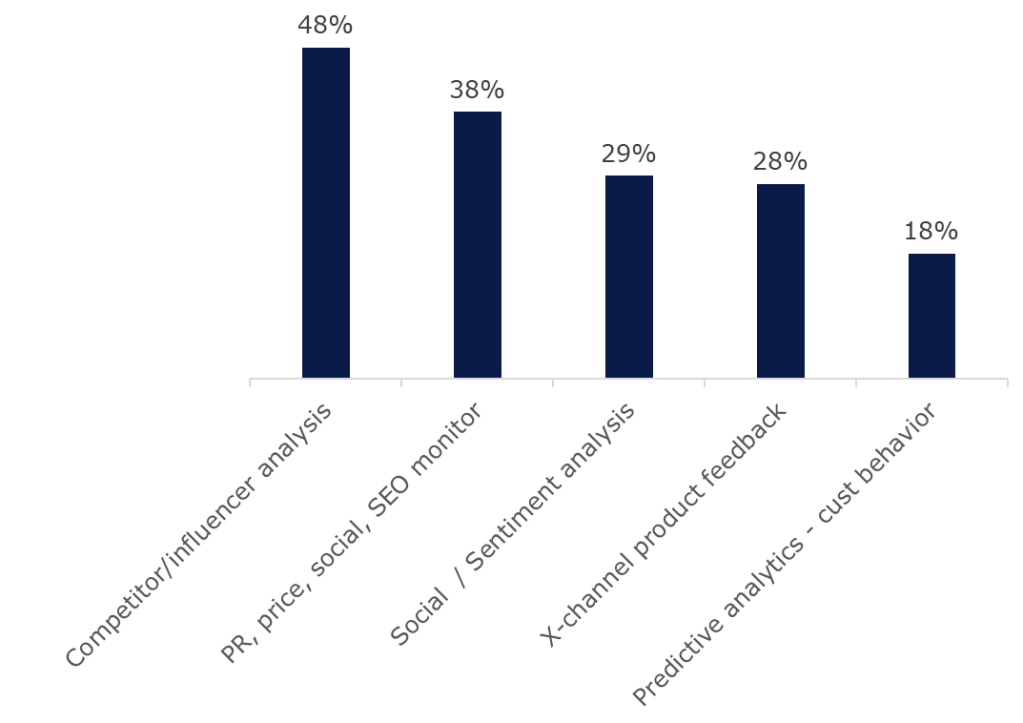 Closely related to the competitive intelligence point, AI’s ability to broadly search the web and digest internal data resources about prospect opinions, brings a range of new insight sources into the field of play for product marketing leaders. AI’s strength in pattern detection and continuous scanning can meaningfully outperform manual processes around “understanding prospects”. AAA asked about a range of these scenarios and found areas of niche usage that product marketers should pay attention to.